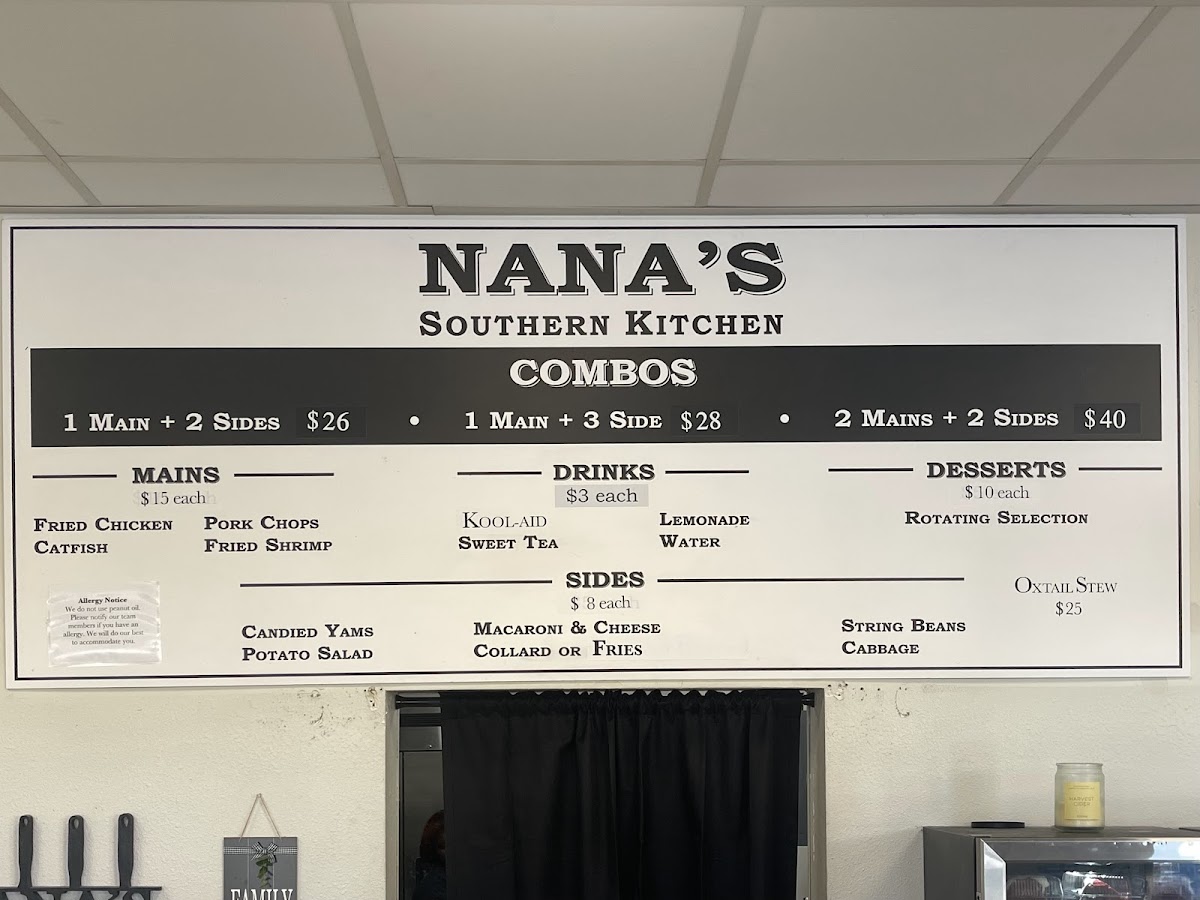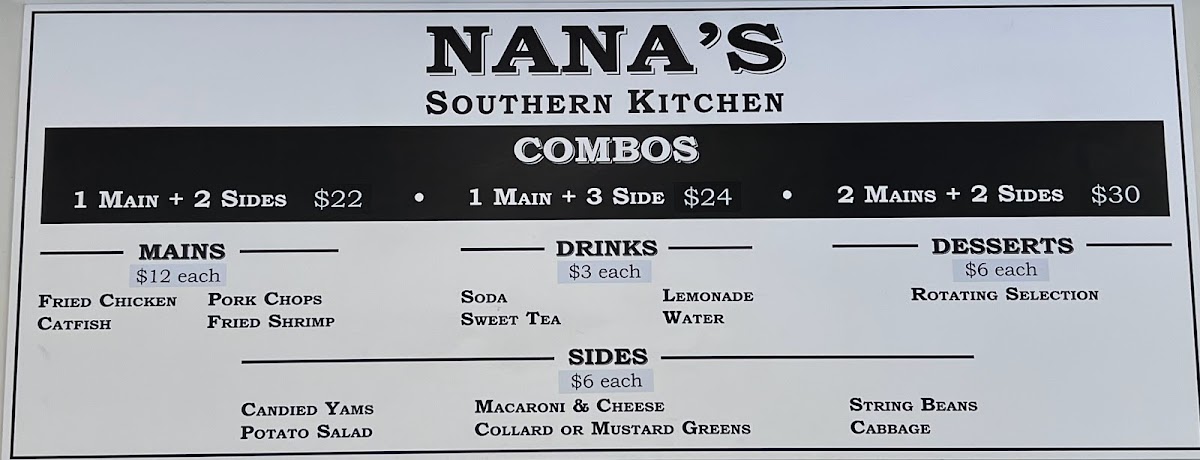 The menu at Nana's Southern Kitchen offers a variety of Southern-style dishes, focusing on classic comfort foods and hearty meals. The food selection is organized into several groups to help visitors navigate their options easily.